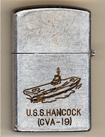 USS Hancock (CVA-19) aviator lighter, Penguin, JAPAN, with Naval Aviator Wings and Ship's crest on the front, still in the box with lid.